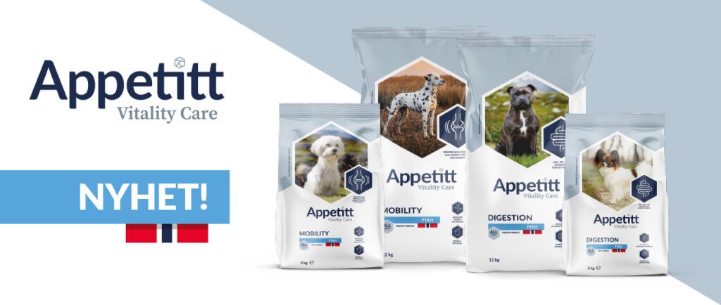 Nyheten Appetitt Vitality Care er en ny fôrserie med funksjonell ernæring, tilpasset hundens behov. Serien består i dag av to varianter; Appetitt Vitality Care Digestion, utviklet for hunder med behov for ekstra støtte til fordøyelsen, og Appetitt Vitality Care Mobility, utviklet for hunder med behov for ekstra støtte til ledd og bevegelighet.